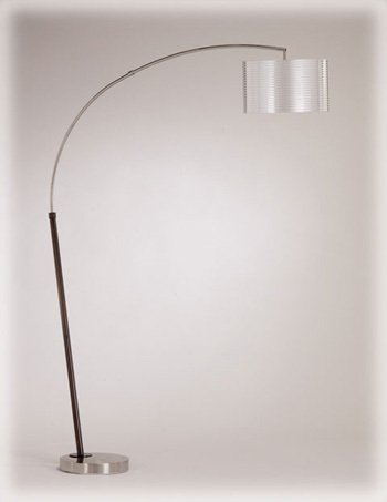 - A chrome and wood finished arc lamp with a silver PVC drum shade and features a dimmer switch.